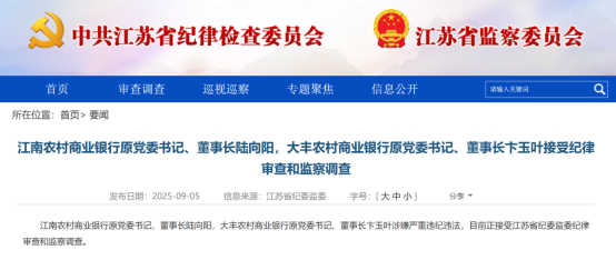 9月5日,江苏省纪委监委官网披露信息,江南农商行原党委书记、董事长陆向阳,大丰农商行原党委书记、董事长卞玉叶涉嫌严重违纪违法,目前正接受江苏省纪委监委纪律审查和监察调查。