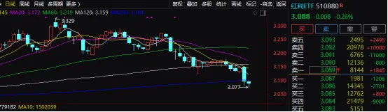早盘,A股银行股加速下跌,工商银行一度跌超2%,近一年来首次跌破半年线(很多投资者将其称为“牛熊分界线”);农业银行、中信银行、中国银行盘中均跌近2%。红利ETF已经走出明显的空头排列,昨天跌破年线之后,今天继续下行。临近上午收盘,该指数却开始反攻。