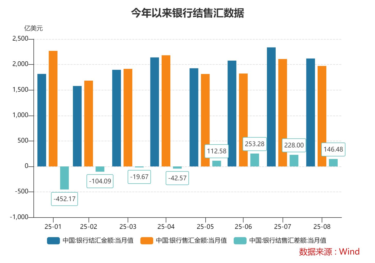 按美元计值,2025年8月,银行结汇2118亿美元,售汇1971亿美元。2025年1—8月,银行累计结汇1.59万亿美元,累计售汇1.58万亿美元。