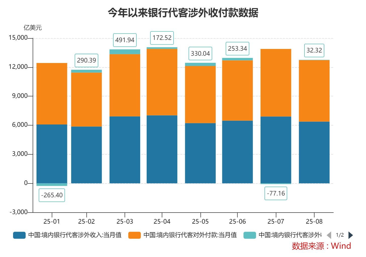按美元计值,2025年8月,银行代客涉外收入6383亿美元,对外付款6350亿美元。2025年1—8月,银行代客累计涉外收入5.19万亿美元,累计对外付款5.07万亿美元。