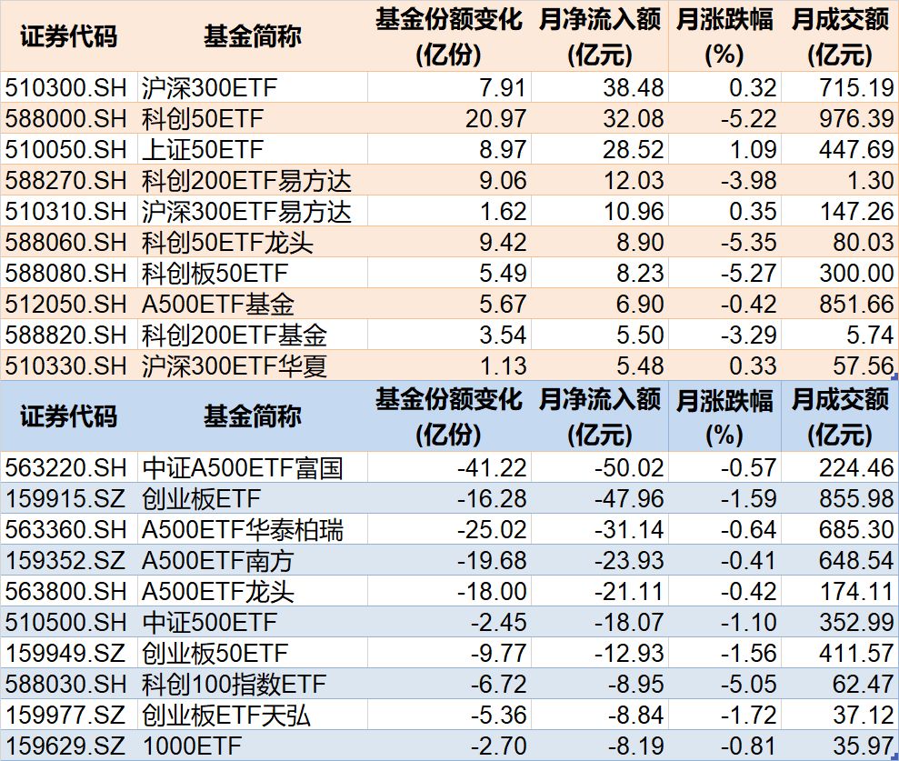 其中,沪深300ETF、科创50ETF在10月获得超30亿元资金净流入。