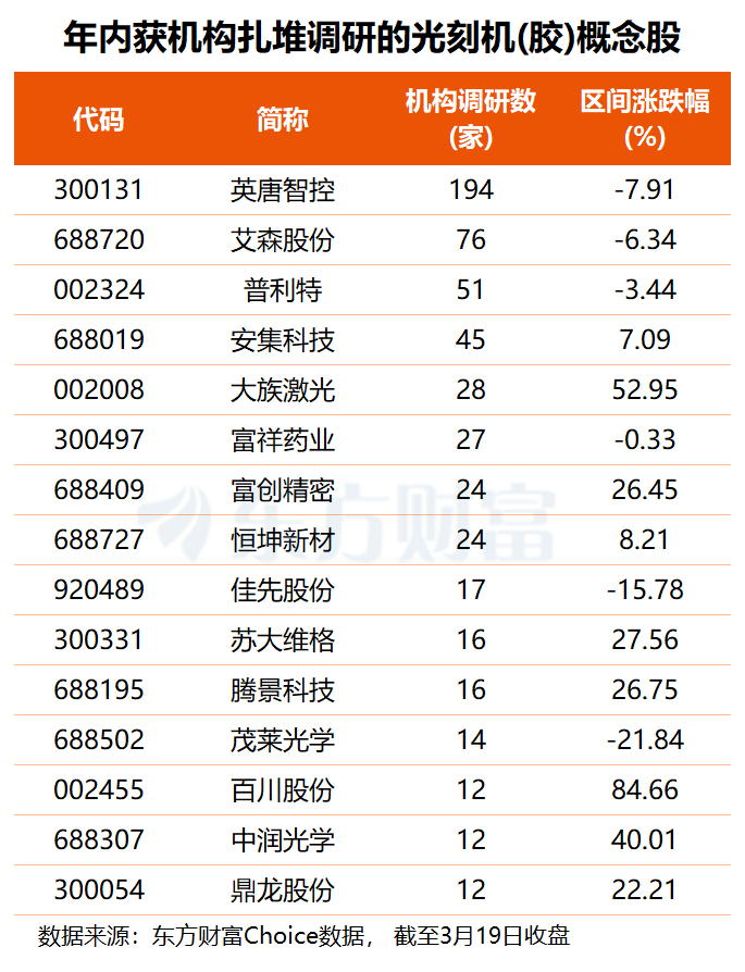机构关注度方面,东方财富Choice数据显示,2026年以来,共有23只光刻机(胶)概念股获得机构调研,其中,英唐智控获近两百家机构扎堆调研,艾森股份、普利特分别获76家和51家机构关注,安集科技、苏大维格、鼎龙股份、瑞联新材等13股机构调研数均在10家至50家之间。